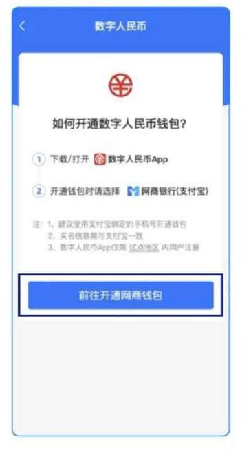 在数字人民币试点地区,新用户可在支付宝首页搜索“数字人民币”,由此下载数字人民币 App,并开通网商银行(支付宝)数字人民币钱包。