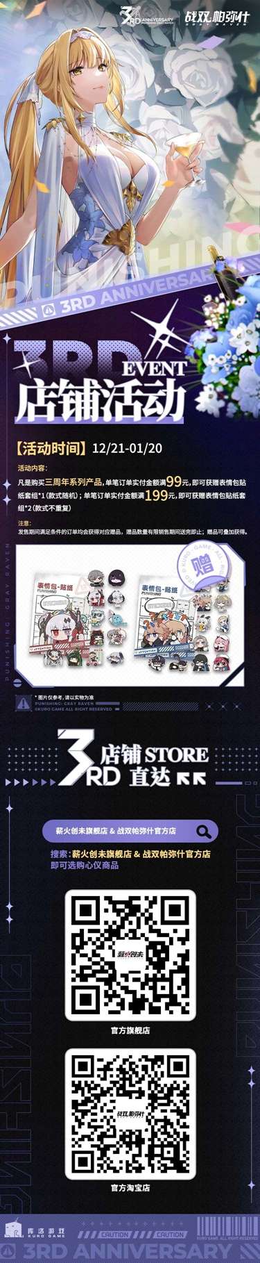 1.满额赠礼:指挥官下单三周年产品,每满99即可获得一款贴纸,满198获得两款贴纸、满297获得三款贴纸(即99的倍数);贴纸合计两款,每款12个人物样式, 人物样式均不重复,如获得3款及以上贴纸款式会重复。