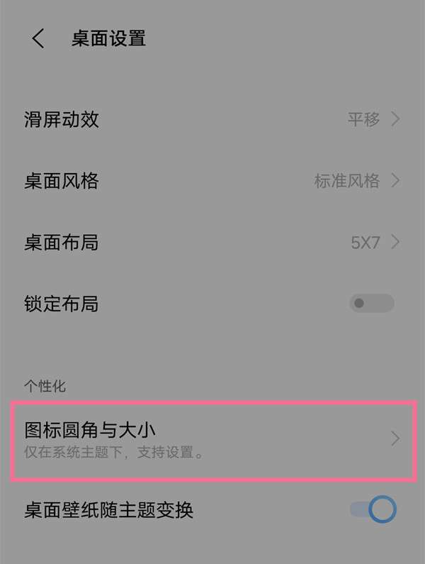 2、进入桌面设置,点击图标圆角与大小。