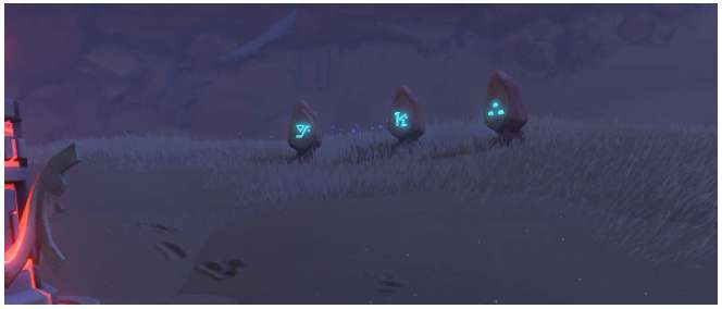 2、解密规则:需要玩家按照风化石碑的数量来点燃对应的火焰柱石碑。第一个火焰柱的风化石碑解密如下图所示: