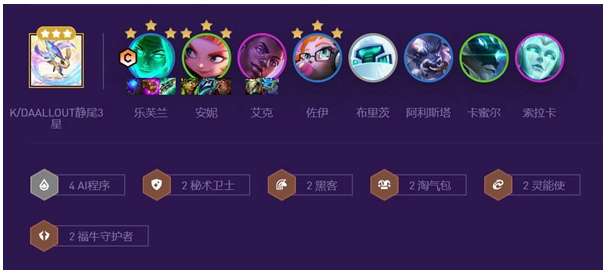 2、阵容羁绊:4AI程序+2秘术卫士+2黑客+2淘气包+2福牛守护者+灵能使。