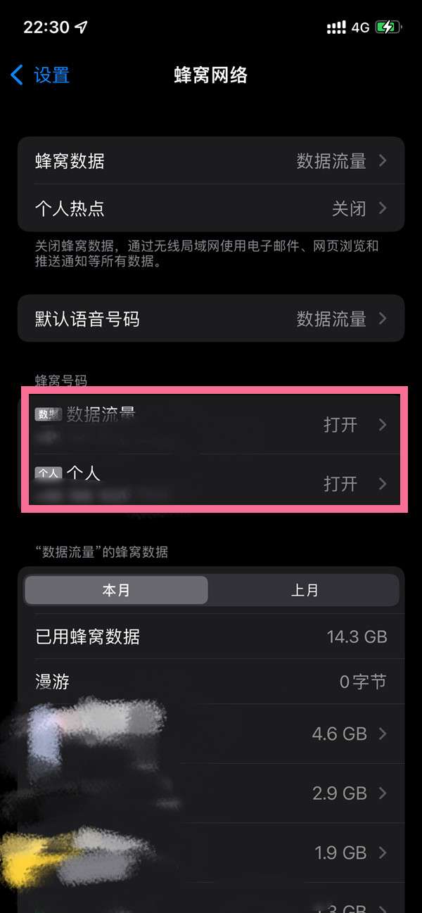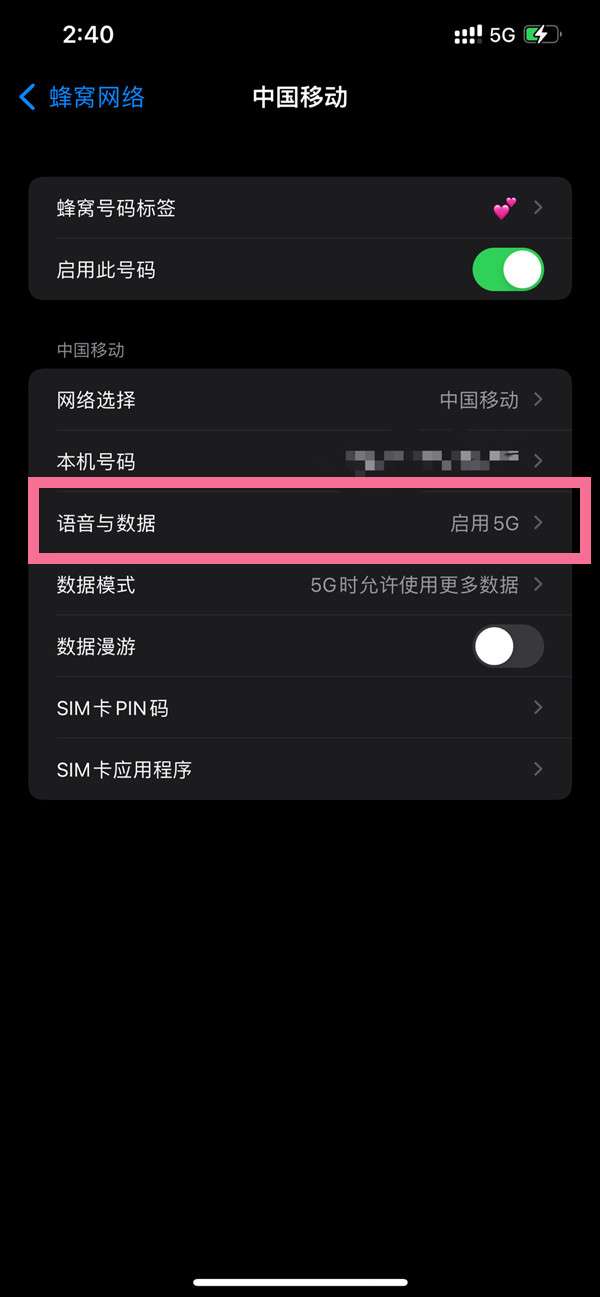 2、找到想要设置的蜂窝号码,选择语音与数据。