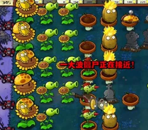 4、在第二波僵尸出现后阳光就充足了,需要摆放两列豌豆向日葵,在小盆菇的位置上放一列双发仙人掌和火炬坚果用来输出。