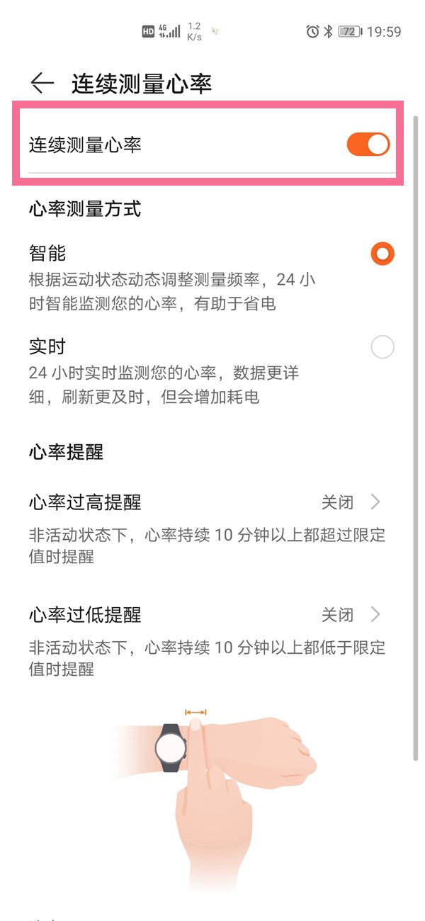 2、点击【连续测量心率】,打开【连续测量心率】右侧的开关即可。
