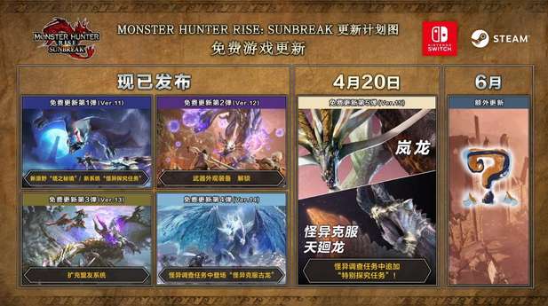 近日,第五弹免费更新情报公开,此次更新追加新登场怪物「岚龙」和「怪异克服天廻龙」,追加全新的怪异调查任务,以及面向老猎人的「特别探究任务」等内容。