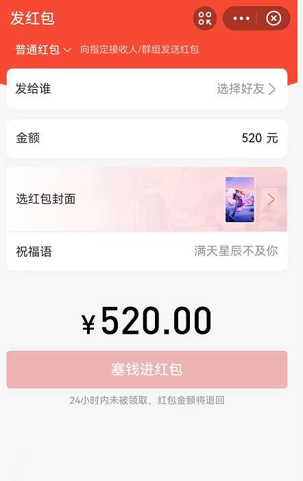 4、选择好友,输入金额就可以发送成功啦~视频红包在发出后,会显示一段专门制作的动画短片,并会附有一段预制的文字搭配,且对方在收到红包后也会看到相对应的动态效果。