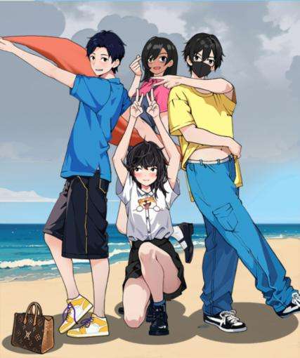 2、白衣服女生:向下滑动眼睛,向上滑动蓝衣服男生口袋,拖动梳子到头发,