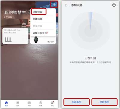 2、打开智慧生活app,找到右上角+号,再点击添加设备,设置已经扫描到的设备或选择扫码添加/手动添加。