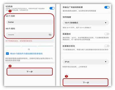 3、设置路由器新的 Wi-Fi 名称和密码,点击下一步,选择保留默认设置,点击下一步即可。