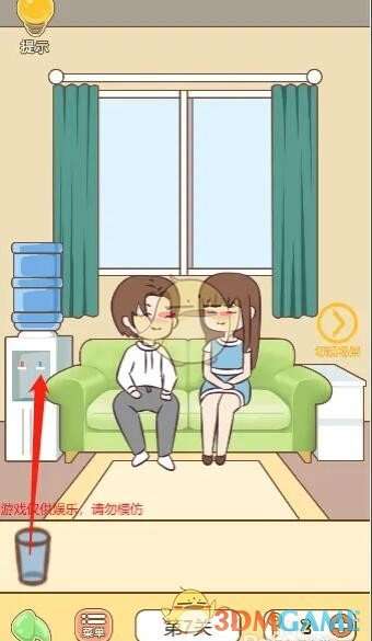 5、回到左边的场景使用水杯装满水,将水杯给沙发上面的男孩子就可以了