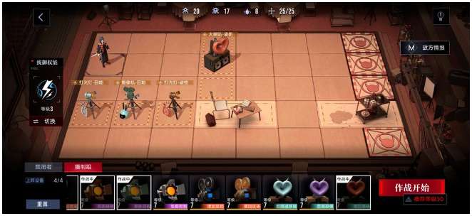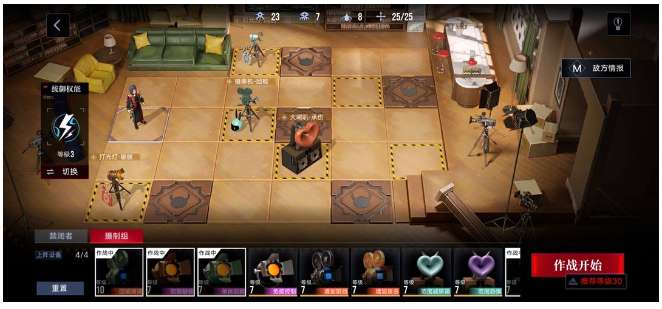 一共4张大图,每张图有AB两点,同一张图A点上场的角色B点也可以上,但是不同图之间只能上场不同角色,如需更换出演人员,需更换角色后重新通关(重复通关不额外消耗体力),可不满员通关,但未知收益是否与满员相同,可上1级角色,可使用摄像机组进行卡位降低关卡难度,不可使用助战