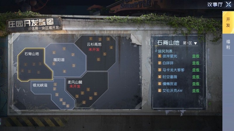 其中有两个问题解决方法很固定,一个是石脊山地住的谁?大家通过营地主页选择右侧的营地建筑中点击议事厅,就可以看到石脊山地中的住户详情。