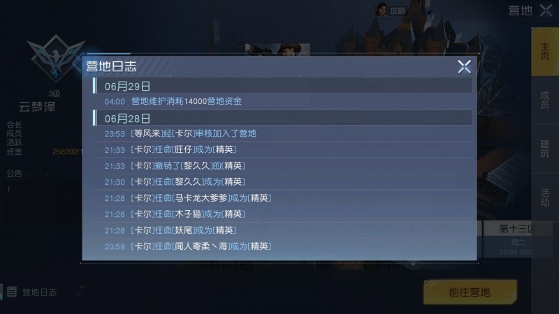 其次是问谁是营地中最新加入的成员,玩家们只需要打开营地主页中的营地日志就可以快速查询营地最近的人员变动情况。