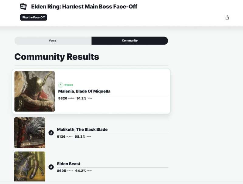 近日,IGN发起一项票选活动,玩家可从《艾尔登法环(Elden Ring)》的25名BOSS中选出十大最难BOSS。目前结果已出炉,排名前三的分别是艾尔登之兽、玛利喀斯和玛莲妮亚,其中玛莲妮亚以91.1%的得票率位列第一。点击这里查看TOP10排行榜>>>