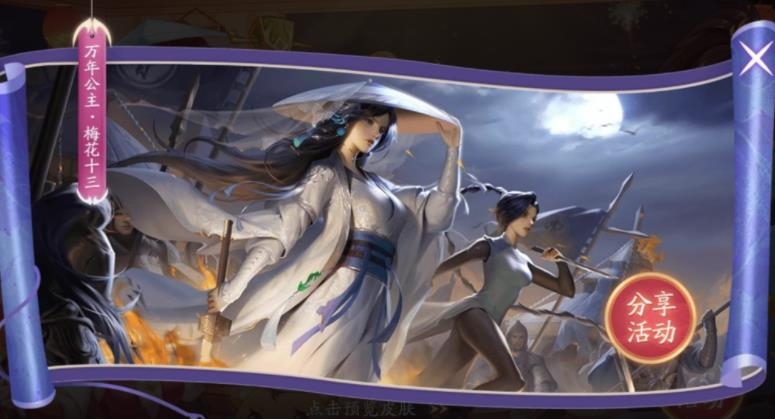 3、万年公主梅花十三皮肤还是非常值得玩家们去白嫖的,毕竟条件很简单,只需要分享活动即可,大家不要错过了哦。