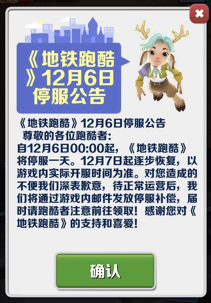 《地铁跑酷》将于12月6日00:00起停服一天,12月7日00:00后逐步恢复。