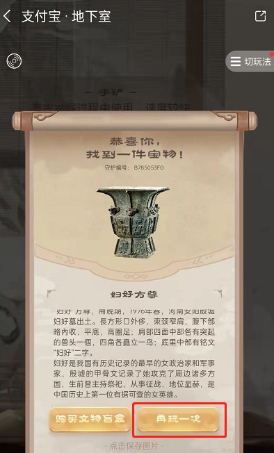 4、清扫四次左右即可挖掘出文物,上面有关于这件宝物的详情内容,您可以选择购买盲盒,也可以点击再玩一次查看更多宝物信息。