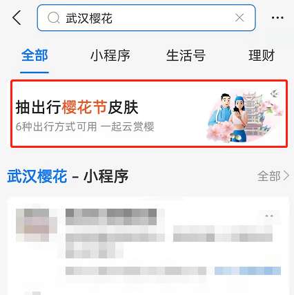 1、打开支付宝在上方搜索“武汉樱花”,结果出现后点击下图框中位置进入。