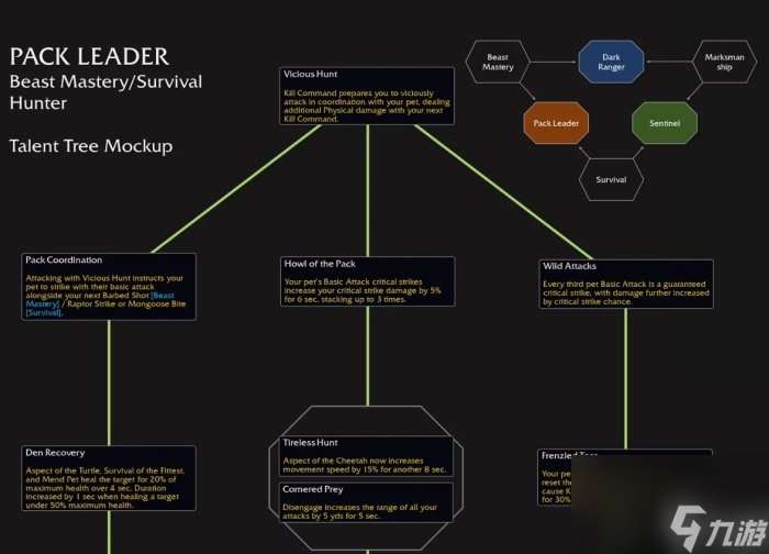 兽群协同:当你使用凶猛狩猎的攻击时,它将引导你的宠物在你下次使用倒刺射击(兽王)、猛禽一击或猫鼬撕咬(生存)的同时发起基础攻击。