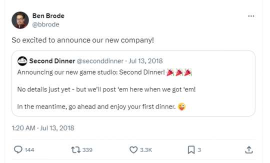 2019年1月,Ben在自己的社交媒体公布,工作室获得了网易3000万美元的投资,同时新产品也确定获得漫威IP授权。漫威娱乐旗下漫威游戏的执行副总裁及负责人JayOng介绍到:“我和Ben、Hamilton曾经共事多年,我觉得他们是制作漫威游戏的不二人选。他们的团队曾制作出一系列游戏史上最优秀的作品。Second Dinner与漫威游戏合作,将在漫威宇宙中创造出下一款超凡的、神奇的、无敌的、无比厉害的游戏。”