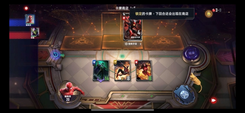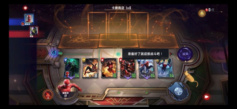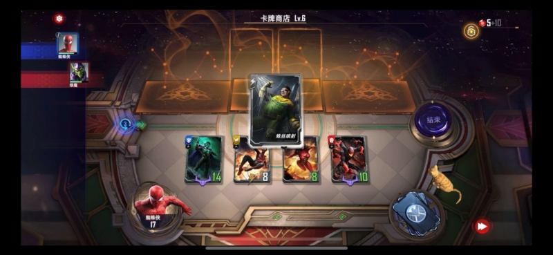 然后先购买毒液秘境魔,技能效果是阵亡和守护,阵亡时召唤2个2战斗力并且具有守护的黑色共生体用来送死铺场,放置首位,然后锁定卡池,攒钱留下来购买魔影迈尔斯。