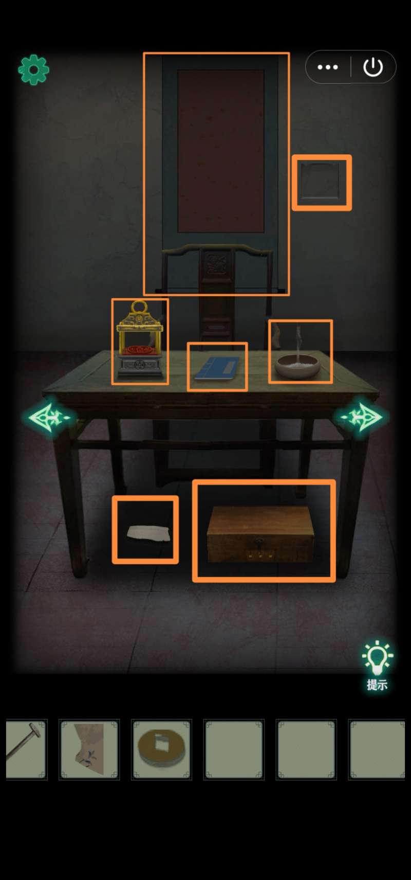 43.右转,把无用纸钱放到书桌上的印鉴中盖章,得【有用纸钱】。发现地上《疑似王氏家主的日记》、地上箱子3个滑钮锁、桌上算筹计数的表示方法、香炉里快熄灭的香、墙上一副空白画卷(可以把已经收集到的1块兰花碎片先放上去,也可以等全收集齐了再一起放)、墙上一个暗格