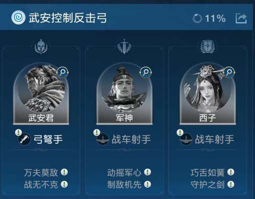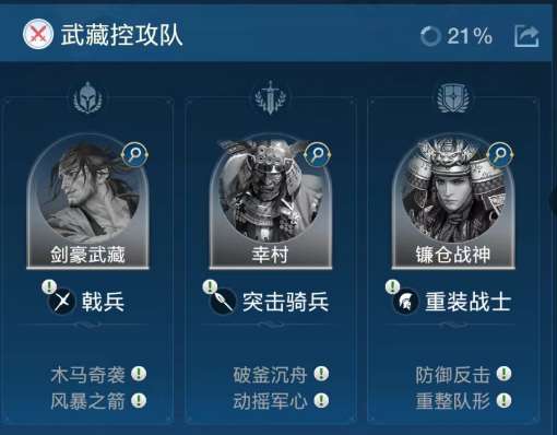 技能搭配方面,由于没有常规辅助治疗英雄,镰仓战神可以搭个反击补输出,再搭个续航的技能,武藏必须搭2个暴力输出技能,幸村可以补控制和辅助技能为全队增益,举例如下: