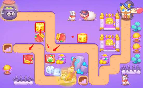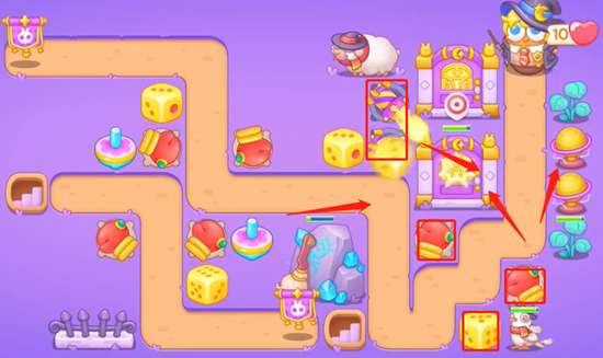 3、慢慢向右边开图,放置更多的炮台来清理终点位置的大道具,尽快拿到全清,注意有飞行兔子所以要用到导弹。