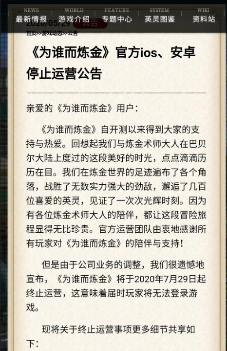 △《为谁而炼金》国服关服公告