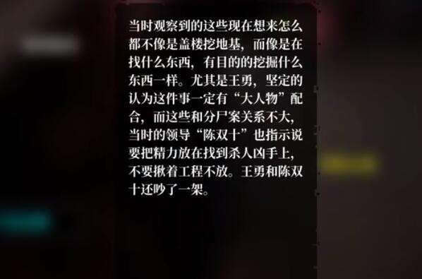当时观察到的这些现在想来怎么都不像是盖楼挖地基,而像是在找什么东西,有目的的挖掘什么东西一样。尤其是王勇,坚定的认为这件事一定有“大人物”配合,而这些和分尸案关系不大,当时的领导“陈双十”也指示说要把精力放在找到杀人凶手上,不要揪着工程不放。王勇和陈双十还吵了一架。