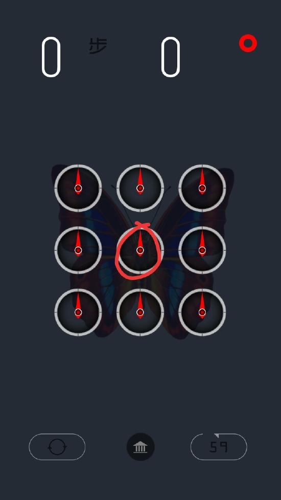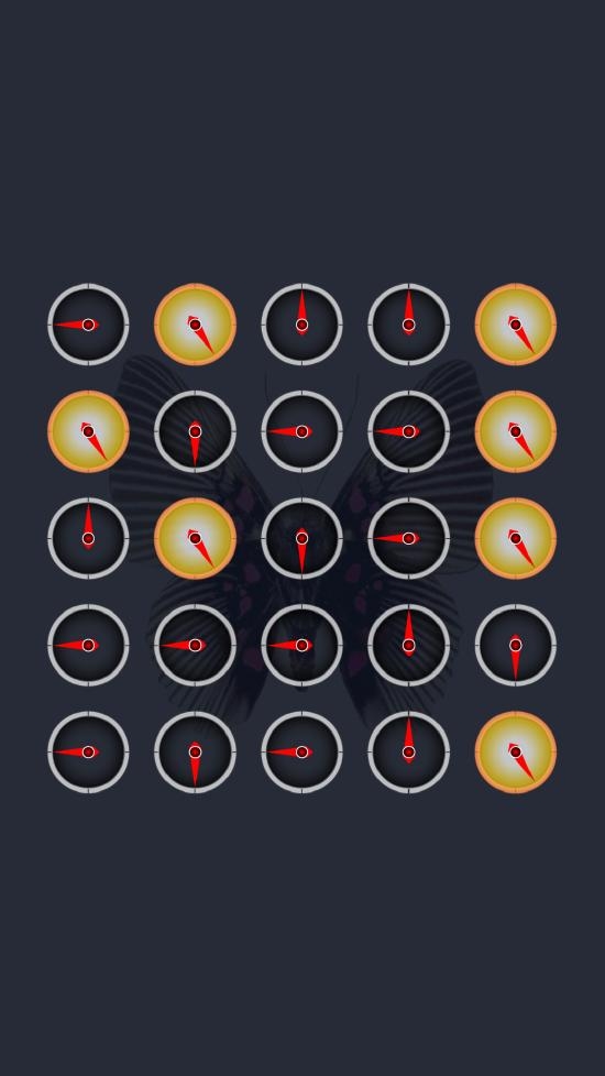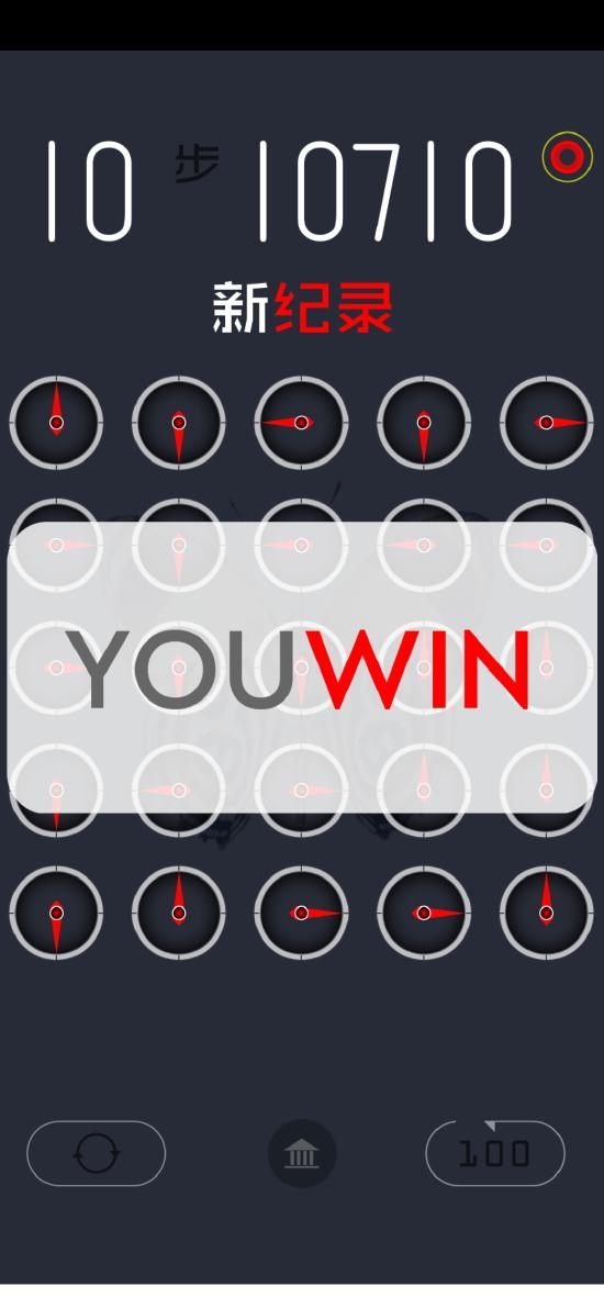 时隔多年,重新体验这款游戏,依旧惊艳,不由感叹,创意想法,从未褪色。游戏中的玩法在游戏名中已说明清楚,走十步,完成10000度的转向。点击一次表盘,即可让指针顺时针转动90度,指针指向的相邻方向的表盘也会相应旋转90度,十步之后最终转动的度数之和,为总成绩。