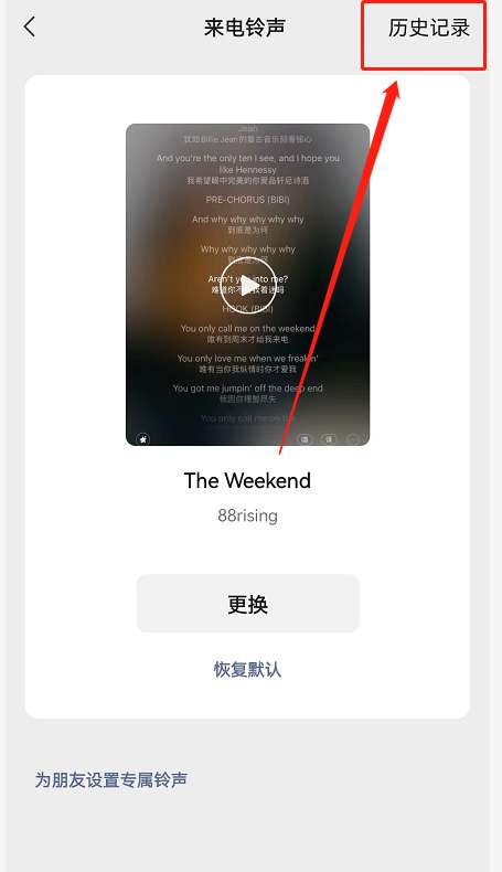 3、在这点击右上角的历史记录,就能查看自己之前设置过的铃声啦~