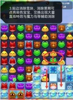 3、贴边三消消除雪块,消除栗熊可点亮染色宝宝,交换后出现大量直线特效与魔力鸟等进行辅助消除,消除右下方雪块,气鼓鱼炸裂可助力消除。