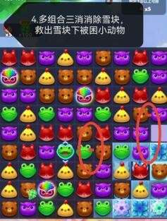 4、多留意组合贴边三消消除,消除雪块救出雪块下被困小动物,也可在周边组合直线、爆炸特效进行辅助消除。