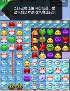 2、打破魔法罐向左推进,借助气鼓鱼炸裂助力消除收集下方魔法药水,并点亮下方魔法罐。