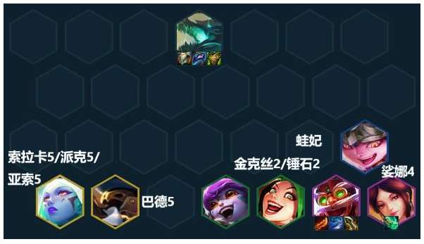 多余装备:琴女和巴德消化多出的法系装备和蓝量装备,小炮捡飞机不要的垃圾,金克丝带旗子当工具人加攻速。后期看情况给高费卡找装备。