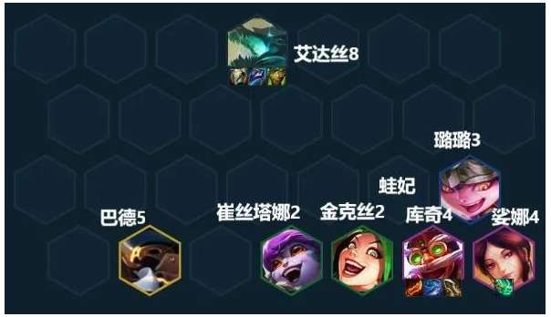 尽快上八,大搜找2星库奇、2星艾达丝+1张琴女,有巴德最好,能提供大范围的控制、开冒险还能提高来高费卡的概率。没有就上锤石,可以和艾达丝开出2护卫羁绊还能出钩恶心对手c位。