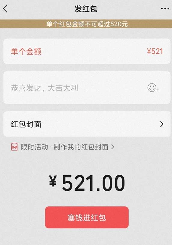 注:情人节红包最高额度不能超过520元。由于“520”谐音“我爱你”,经常成为有情之人间表达爱意的手段。