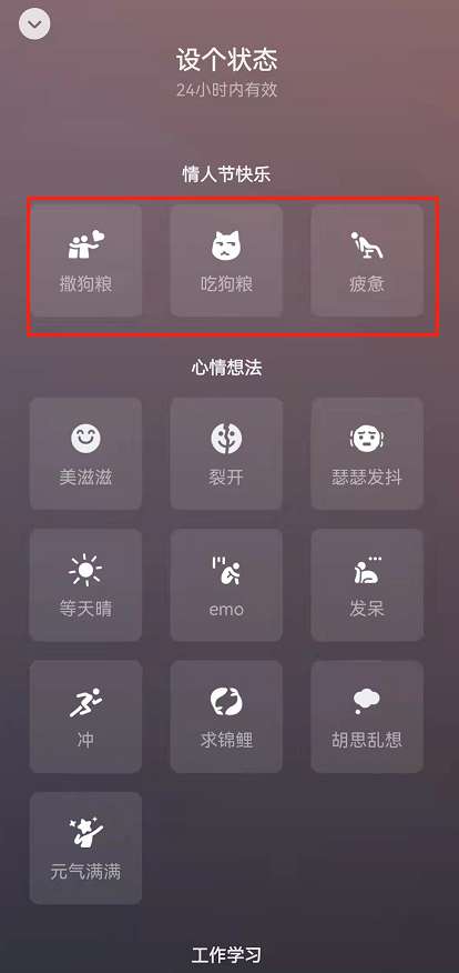 2、在这大家就可以看到情人节限定的三个状态“撒狗粮”“吃狗粮”“疲惫”,小伙伴们可以根据自己的当前情况随意选择一种。