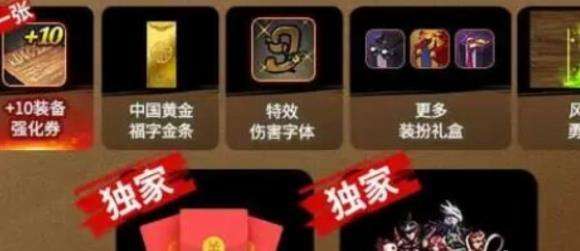 3、福袋中的道具奖励有10个装备强化劵、中国黄金福字金条、特效伤害字体、更多装扮礼盒、风一样的勇士光环。