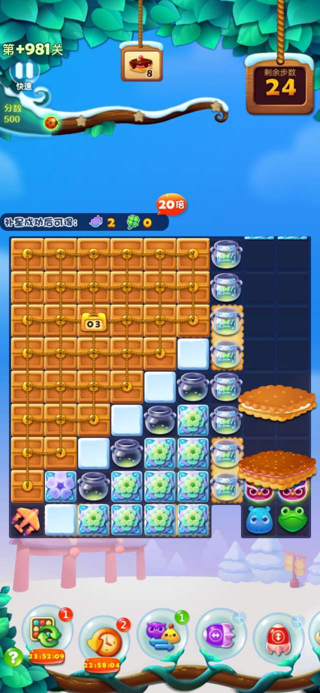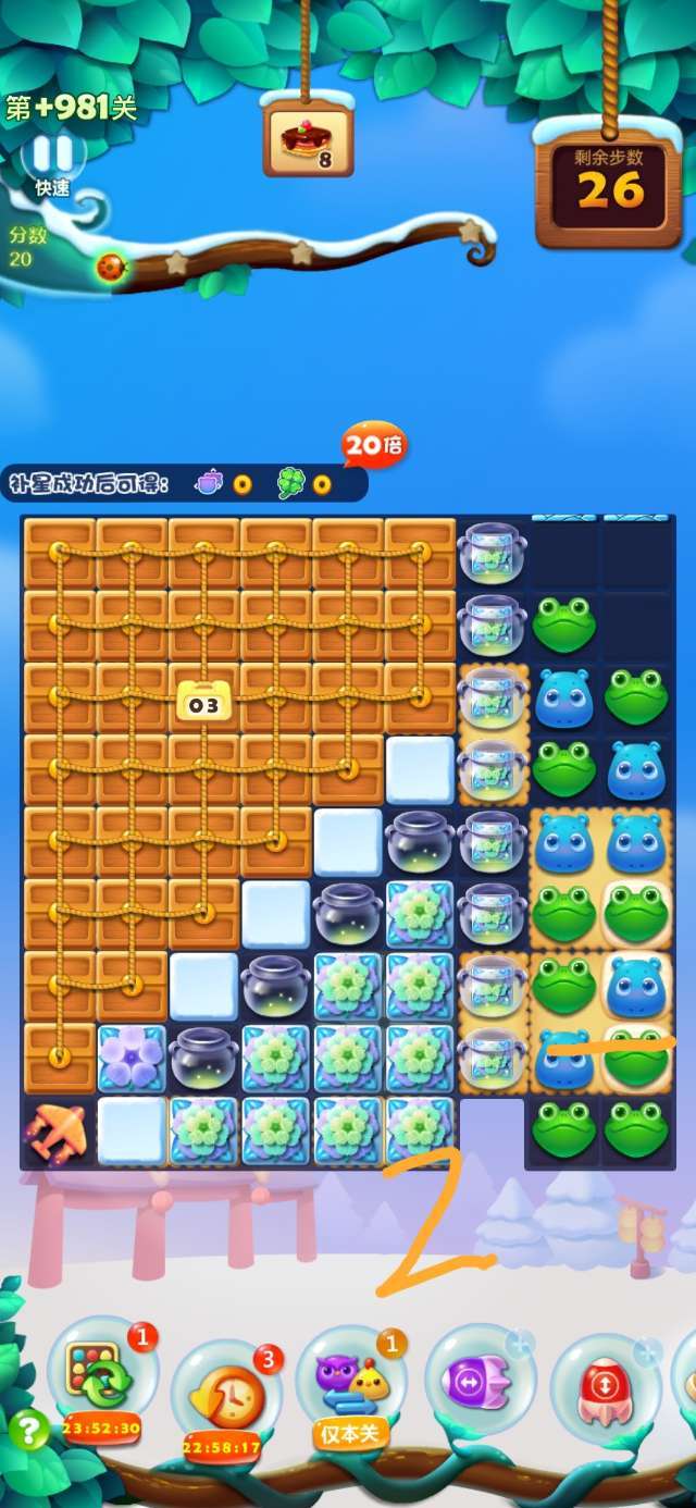 连续消除得分:一般消除一下30分,连消每次+30,60、90、120依次叠加;冰块里面消除一次1000,连消一次+1000,2000、3000、4000依次叠加;5+4组合一下给2000,每个被变化动物200分,每打掉一个普通的动物15分,冰块1500。