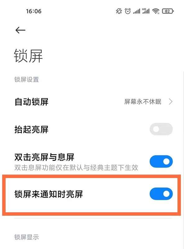 2、将锁屏来通知时亮屏后面的按钮开启即可。