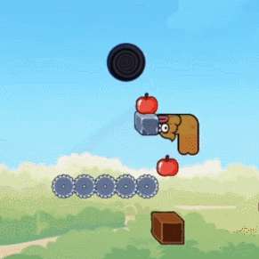 1、向左把石头顶下去,踩在石头上向上吃掉苹果