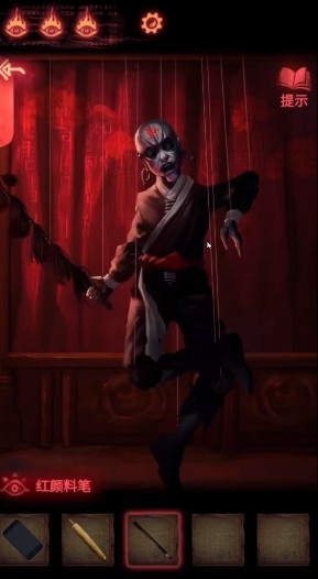 1、来到舞台这里,点击后面的舞台幕布,之后使用红色颜料笔对木偶的额头使用。