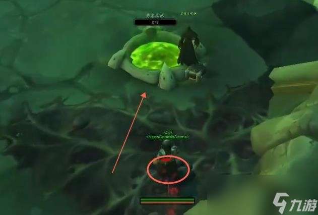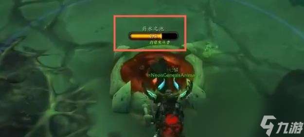 背上之后我们就可以回到刚刚接任务的地方,有一个非常大的药水池子。我们可以看到上面有着三种软泥颜色的分布,只需要靠近之后就可以扔进去了。不是下图是下图后面的一个更大的红色池子。