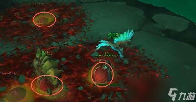 首先找到任务地点旁边的燃烧的提取物或者是其他的人形软泥大怪。任务怪的脚下会有一个黄色的圆圈,如下图所示的红色的软泥怪就是其中之—。