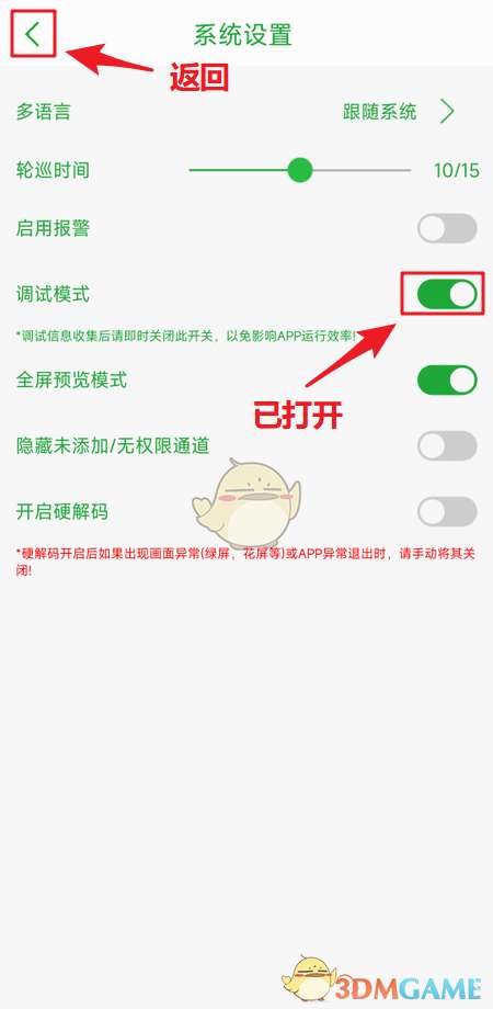2、接着在【系统设置】界面,通过点击【调试模式】右侧开关把它打开。
