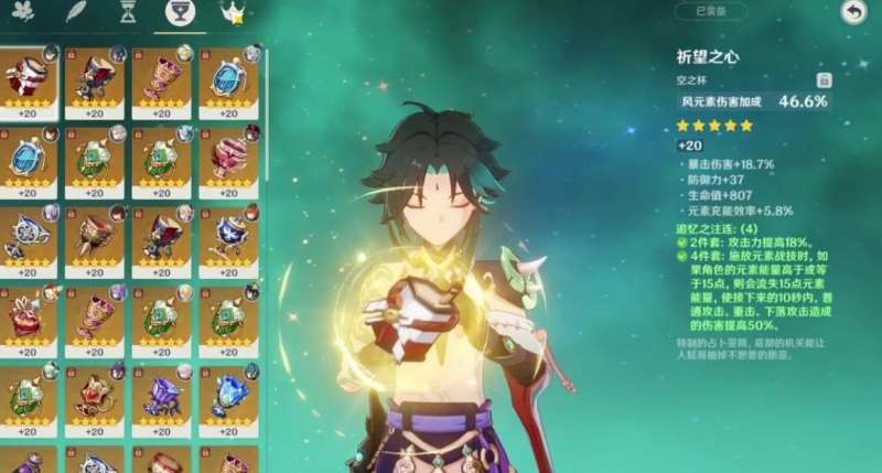 在圣遗物上推荐瓦加给魈选择四辰砂套,在释放大招持续掉血期间可以吃满被动特效,能够让其在对战时打出自己的最高伤害。散件推荐两件角斗与两件风之使者,能够增加魈的风属性伤害,使其元素战技伤害变得更高。在萌新过度阶段,可以为魈选择四狂战套,为其增加百分之二十的攻击力,可以使用很长一段时间,直到刷到更好的圣遗物。为魈选择的圣遗物主词条最好带有暴击率、攻击、风伤等效果,而副词条则要优先选择暴伤、爆率等。