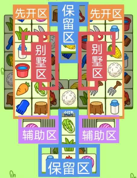 一个T字型大别墅,一个工字型大别墅,开局先消除橙色区。然后按照一层层均匀消除表面牌,哪里压牌此较多就先消除哪里,必要时可以用盲盒区辅助消除表面牌。尽量还是必别墅区内互相消除为王。蓝色区有叠牌,但是不多,全部保留到后期使用。