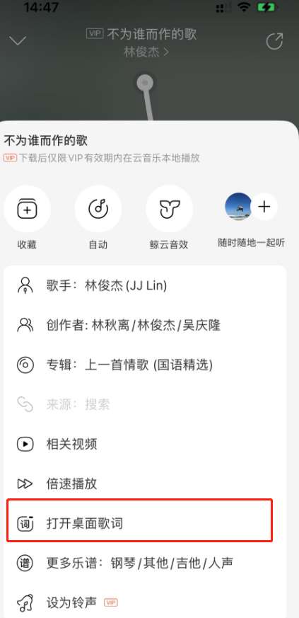 4、在下方弹出的菜单中可以看到打开桌面歌词功能,点击开启。